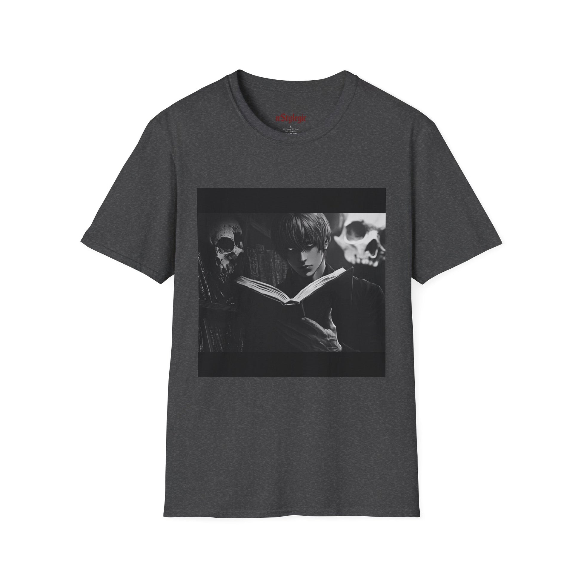 This tee captures the iconic anti-hero from Death Note, holding the infamous Death Note book—framed by twin skulls in a stark black-and-white design. It’s a tribute to power, intellect, and the thin line between justice and obsession.
